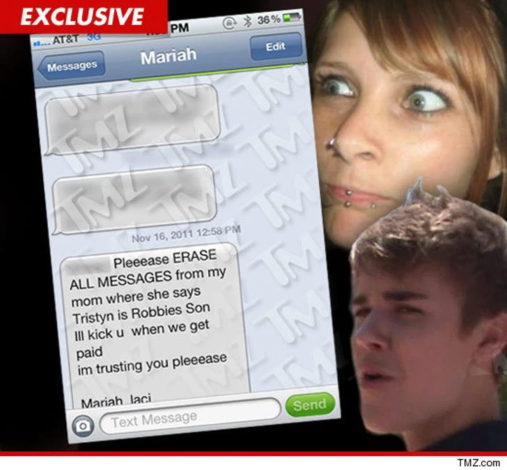 TMZ leaked text messages of Mariah talking to a friend, begging him to erase an incriminating text in which her mom says someone other than Justin Bieber is the baby daddy, and then promising to give him a cut of the action when she scores a payday.[4]